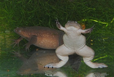 Xenopus () (Gk., ξενος, xenos=strange, πους, pous=foot, commonly known as the clawed frog) is a genus of highly aquatic frogs native to sub-Saharan Africa. Twenty species are currently described within it. The two best-known species of this genus are Xenopus laevis and Xenopus tropicalis, which are commonly studied as model organisms for developmental biology, cell biology, toxicology, neuroscience and for modelling human disease and birth defects.The genus is also known for its polyploidy, with some species having up to 12 sets of chromosomes.