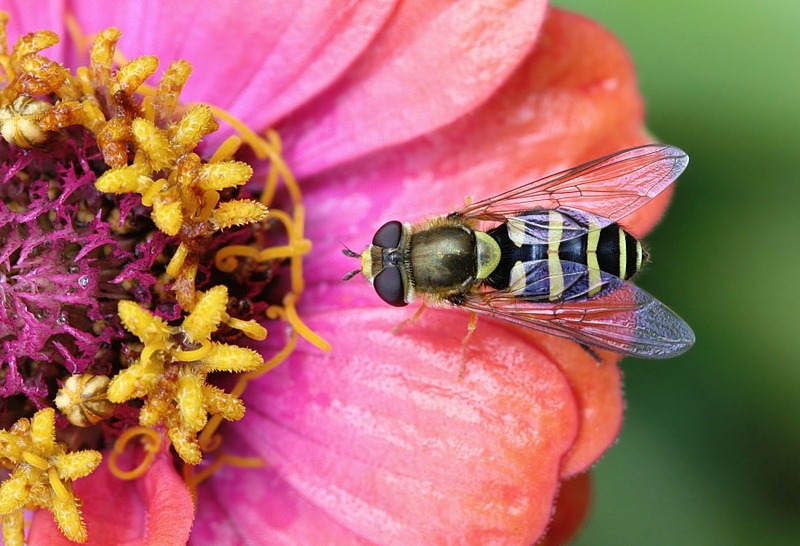 Eupeodes americanus, the American hoverfly, is found throughout North America and inhabits meadows, and fields with flowers and foliage. Adults feed on nectar, whereas their larvae feed on aphids. The adult fly is black to metallic green, and has three yellow bands on its abdomen. Its face is a light yellow with large black compound eyes on either side, and its wings are clear; it is 9–12 mm in body length. The larvae are mature at around 11 mm, and they are yellow-white to salmon brown, with markings of black and white or yellow-white. The lighter markings consist of a transverse rectangular bars on segments 6 to 11, and a narrow line along each side of the larvae. Early instars have visible black setae. The larvae are active feeders. They are being considered as suitable biological…