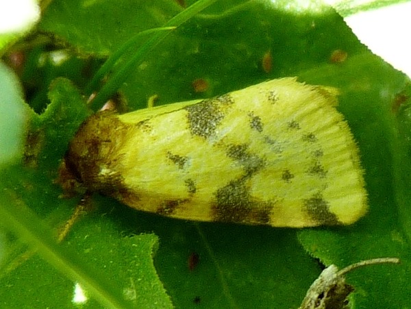 Azenia obtusa, the obtuse yellow moth, is a moth of the family Noctuidae. The species was first described by Gottlieb August Wilhelm Herrich-Schäffer in 1854. It is found in North America from southern Ontario and New York to Florida and west to Texas and Missouri. The wingspan is 18–25 mm. Adults have light yellow forewings with three large violet-brown costal spots and usually two small ones. The hindwings are paler yellow with one to three slightly darker lines. They are on wing from June to August.The larvae feed on Ambrosia trifida.