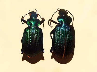 Calosoma is a genus of large ground beetles that occur primarily throughout the Northern Hemisphere, and are referred to as caterpillar hunters or caterpillar searchers. Many of the 167 species are largely or entirely black, but some have bright metallic coloration. They produce a foul-smelling spray from glands near the tip of the abdomen. They are recognizable due to their large thorax, which is almost the size of their abdomen and much wider than their head.In 1905, Calosoma sycophanta was imported to New England for control of the gypsy moth. The species is a voracious consumer of caterpillars during both its larval stage and as an adult, as are other species in the genus. For this reason, they are generally considered beneficial insects. Several species of this beetle, most notably…