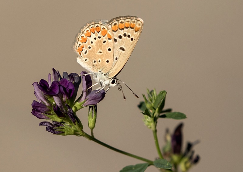 The common blue butterfly (Polyommatus icarus) is a butterfly in the family Lycaenidae and subfamily Polyommatinae. The butterfly is found throughout the Palearctic. Butterflies in the Polyommatinae are collectively called blues, from the coloring of the wings. Common blue males usually have wings that are blue above with a black-brown border and a white fringe. The females are usually brown above with a blue dusting and orange spots.