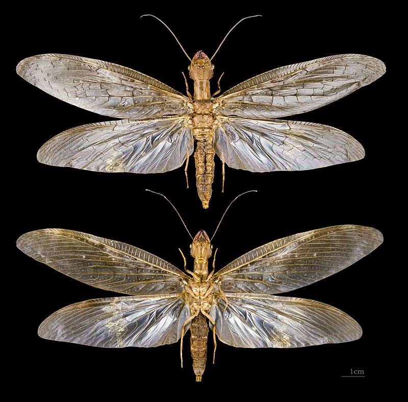 The eastern dobsonfly, Corydalus cornutus, is a large insect in the Corydalidae family. It is found in eastern North America in regions with fast-flowing streams where its aquatic larvae develop. These are known as hellgrammites and are among the top invertebrate predators in the streams in which they live. They are used by anglers as bait.