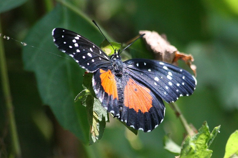 Chlosyne janais, the crimson patch or janais patch, is a common New World butterfly found from Colombia north through Central America and Mexico to southern Texas, with occasional sightings in southeastern Mexico and northern Texas. The dorsal and ventral wing surface is black with several undulating rows of small white spots on the medial forewings and along all outer wing margins. On each dorsal hindwing is a medial orange-red patch situated anteriorly. The ventral hindwings have a fragmented yellow proximal patch bordered by a thick postmedial band of red that does not reach the wing margins; maximum wingspan is 4.8–6.7 cm. Adults inhabit the periphery of lowland tropical to subtropical forests, fields, and along streams, where they feed on flower nectar. Reproduction is continuous in…