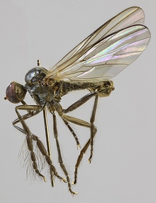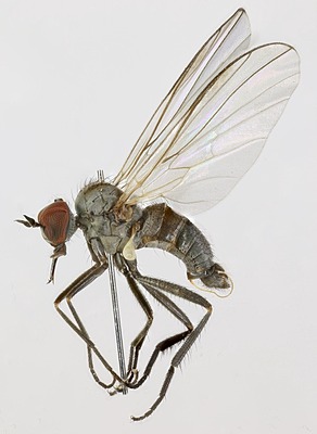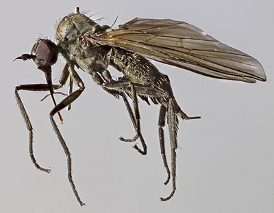 Empididae is a family of flies with over 3,000 described species occurring worldwide in all the biogeographic realms but the majority are found in the Holarctic. They are mainly predatory flies like most of their relatives in the Empidoidea, and exhibit a wide range of forms but are generally small to medium-sized, non-metallic and rather bristly. Common names for members of this family are dagger flies (referring to the sharp piercing mouthparts of some species) and balloon flies. The term "dance flies" is sometimes used for this family too, but the dance flies proper, formerly included herein, are now considered a separate family Hybotidae.
