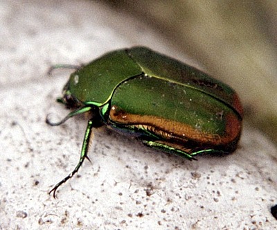 Cotinis mutabilis, also known as the figeater beetle (also green fruit beetle or fig beetle), is a member of the scarab beetle family. It belongs to the subfamily Cetoniinae, comprising a group of beetles commonly called flower chafers since many of them feed on pollen, nectar, or petals. Its habitat is primarily the southwestern United States and Mexico. Figeater beetles are often mistaken for green June beetles (Cotinis nitida) and occasionally Japanese beetles (Popillia japonica), which occur in the eastern US.Figeater beetle larvae, commonly called "crawly backs", roll on their backs and propel themselves upsidedown. Adult figeater beetles grow to approximately 1.25 inches (3.2 cm). They are a semi-glossy green on the top and a brilliant iridescent green on the underside and legs. They…