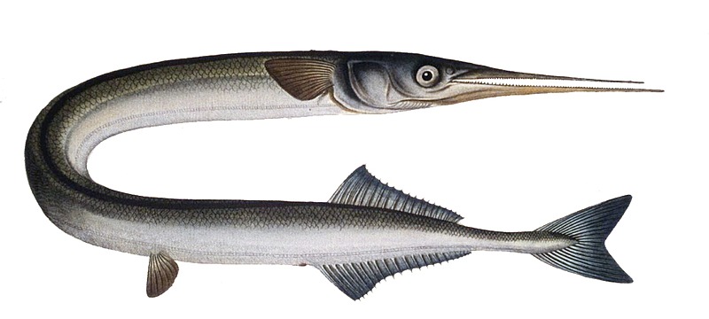 The garfish (Belone belone), also known as the garpike or sea needle, is a pelagic, oceanodromous needlefish found in brackish and marine waters of the Atlantic Ocean, the Pacific Ocean and the Mediterranean, Caribbean, Black, and Baltic Seas.