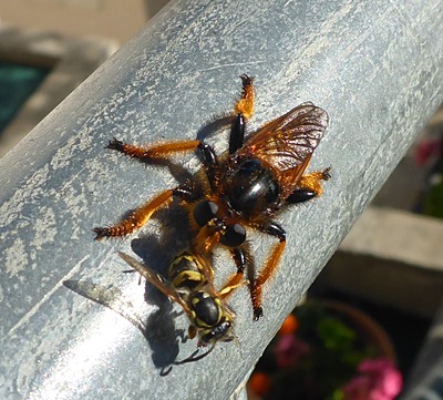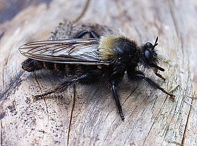 Laphria is a genus described by Johann Wilhelm Meigen in 1803, belonging to the family Asilidae, subfamily Laphriinae. Members of this genus are known as bee-like robber flies. This genus has a Holarctic distribution, occurring in Europe, Asia, and North America. They prey on a variety of insects, including other robber flies, bees, wasps and beetles. Like other asilids, they use their proboscis to penetrate the body of their prey and inject enzymes which dissolve the tissues. These large flies measure 15–25 mm (0.59–0.98 in) in length. Most Laphria species are quite hairy and black in color. Some have bee-mimicking markings with black and yellow stripes (See Laphria thoracica). They can be encountered from July through September.