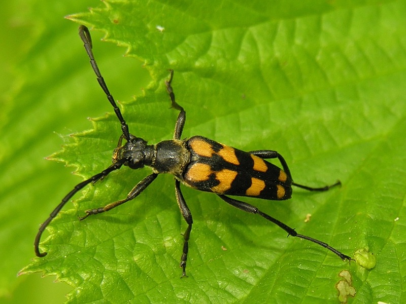Leptura quadrifasciata, the longhorn beetle, is a species of beetle in the family Cerambycidae. It was described by Carl Linnaeus in his landmark 1758 10th edition of Systema Naturae.Adult beetles are 11–20 mm long, black with four more or less continuous transverse yellow bands. In extreme cases the elytra may be almost entirely black. It is found throughout the northern and central Palaearctic region. Larvae make meandering galleries in various trees, including oak, beech, birch, willow, alder, elder and spruce. The life cycle lasts two or three years.