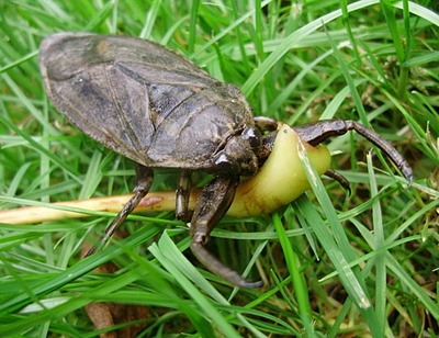Lethocerus is a genus of the hemipteran family Belostomatidae, known colloquially as giant water bugs, distributed in tropical, subtropical and temperate areas of the world. The greatest diversity of species occurs in the Americas, with only a single species in Europe, two in Africa, two in Australia and three in Asia. It includes the largest true bugs with species capable of reaching a length of over 12 centimetres (4.7 in). The South American L. grandis and L. maximus are the only species to commonly exceed 9 cm (3.5 in), with more typical lengths for the remaining species being between 4.5 and 9 cm (1.8 and 3.5 in). Lethocerus sp. are distinguished from other genera in the Lethocerinae (Benacus and Kirkaldyia) by two symmetrical furrows in the inner pad of setae on the fore femur, the…