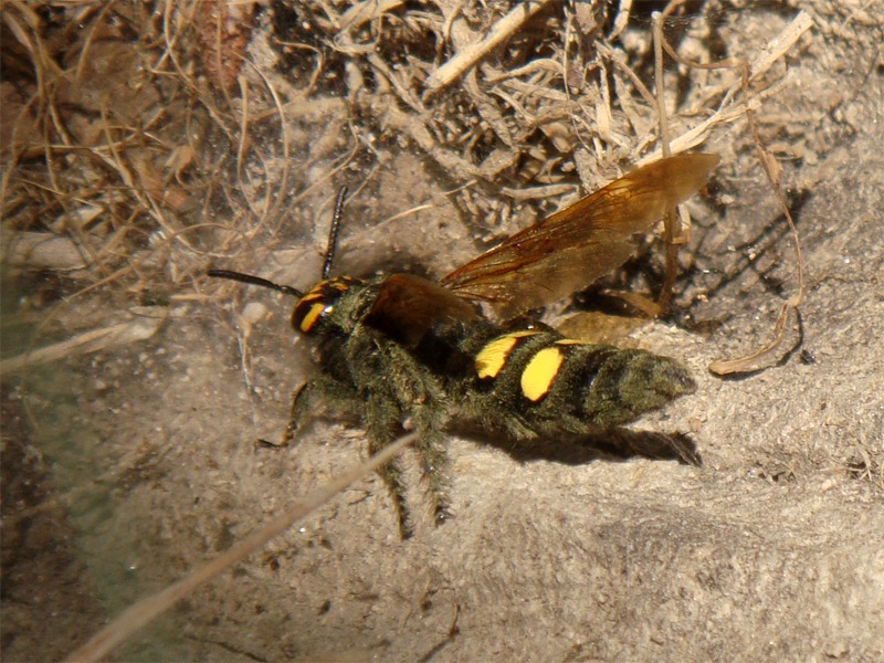 The mammoth wasp (Megascolia maculata) is a very large wasp (the largest in Europe), with the female reaching up to 6 centimetres (2.4 in), whereas the male is smaller. The species can be seen in warm weather, from May to September.