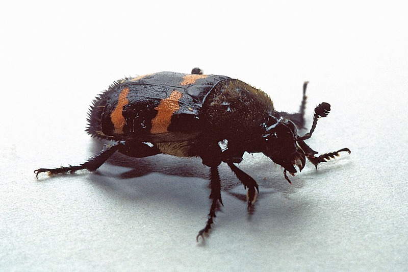 Nicrophorus tomentosus (gold-necked carrion beetle or tomentose burying beetle) is a species of burying beetle that was described by Friedrich Weber in 1801. The beetle belongs to the family Silphidae which are carrion beetles. The beetles have sensitive antennae that contain olfactory organs. Thus, the beetle can locate dead animals (carcass), and then as the name suggests, can bury them. However, unlike other burying beetles, N. tomentosus does not feed these brood carcasses. They instead eliminate the soil under the carcass, so the carcass will sink underneath. Recognition of these beetles can be distinguished by its black color with orange markings on the wing covers (elytra).