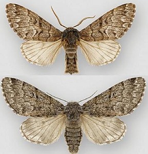 Panthea virginarius, the Cascades panthea, is a moth of the family Noctuidae. It is mainly found west and north of the Great Basin, from the coast of southern California northward to the Queen Charlotte Islands of British Columbia and the Alaskan Panhandle, eastward to central California, northern Nevada, Idaho, north-western Wyoming, western Montana, and south-western Alberta. A disjunct population is found in the Cypress Hills of Alberta and Saskatchewan. The species is highly variable in both size and colour; the angelica and portlandia forms for example were considered separate species up to 2009. The larvae feed on Pseudotsuga menziesii and other conifers.