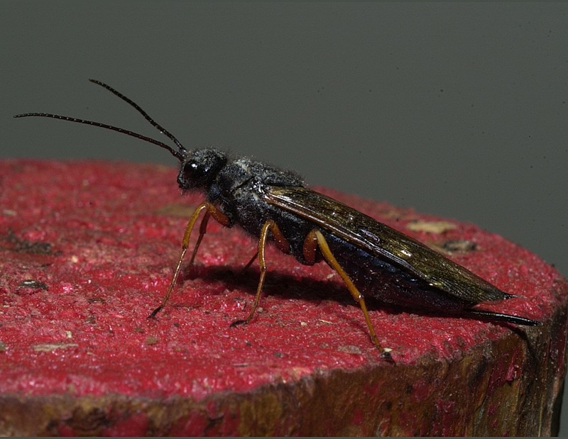 The sirex woodwasp (Sirex noctilio) is a species of horntail, native to Europe, Asia, and northern Africa. Adults vary in length from 9 to 36 mm (0.35 to 1.42 in). This woodwasp is an invasive species in many parts of the world, including Australia, New Zealand, North America, South America, and South Africa, where it has become a significant economic pest of pine trees. The wasp can attack a wide variety of pine species, although some species seem to be more susceptible than others, and stressed trees often are attacked. During oviposition, the female wasp lays two eggs with or without a mucoid substance and a symbiotic fungus for the larvae to feed on once they hatch. The mucoid substance is toxic to trees and aids in tree decline. The ascospores from the symbiotic fungus, Amylostereum…
