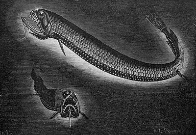 Stomias is a genus of barbeled dragonfishes. They live in the mesopelagic zone of all oceans and show diel vertical migration and sexual dimorphism (males are smaller, have larger eyes and larger postorbital photophores than females.