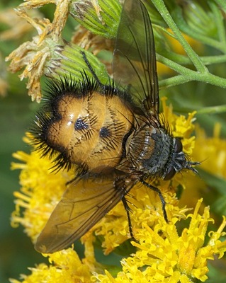 The Tachinidae are a large and variable family of true flies within the insect order Diptera, with more than 8,200 known species and many more to be discovered. Over 1300 species have been described in North America alone. Insects in this family commonly are called tachinid flies or simply tachinids. As far as is known, they all are protelean parasitoids, or occasionally parasites, of arthropods, usually other insects. The family is known from many habitats in all zoogeographical regions and is especially diverse in South America.