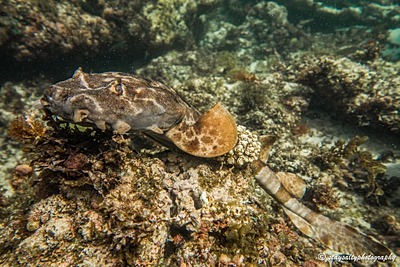 The wobbegong is the common name given to the 12 species of carpet sharks in the family Orectolobidae. They are found in shallow temperate and tropical waters of the western Pacific Ocean and eastern Indian Ocean, chiefly around Australia and Indonesia, although one species (the Japanese wobbegong, Orectolobus japonicus) occurs as far north as Japan. The word wobbegong is believed to come from an Australian Aboriginal language, meaning "shaggy beard", referring to the growths around the mouth of the shark of the western Pacific.