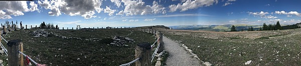 are believed to have been used for 10,000 years. The trail to the Medicine Wheel is an easy 3 mile out-and-back walk along a dirt road with observation points and resting spots along the way. The highest point, where the wheel can be found, is located nearly 10,000 feet above sea level. Visitors frequently come to this sacred landmark looking for inspiration, solitude, and a place to pray or meditate.