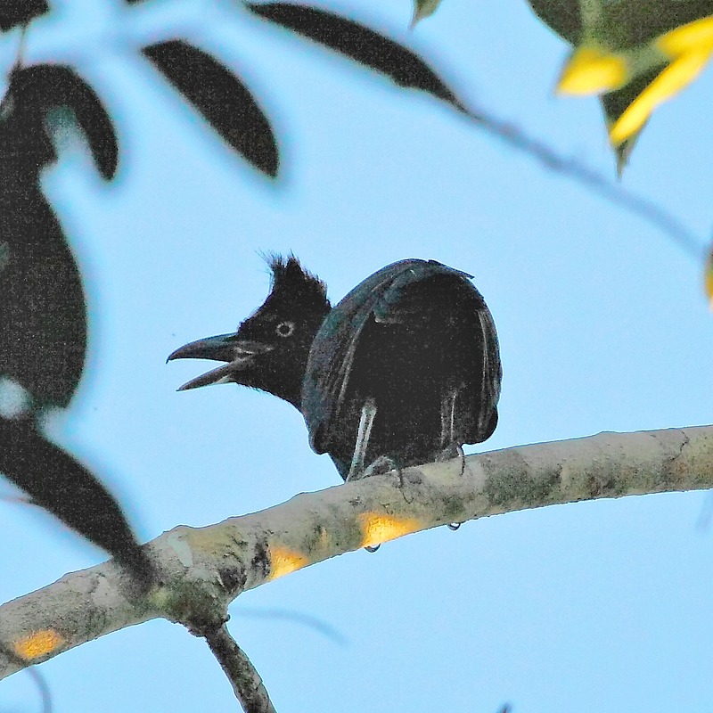 The Amazonian umbrellabird (Cephalopterus ornatus) is a species of bird in the family Cotingidae native to the Amazon basin with a separate population on the eastern slopes of the Andes. The male bird is entirely black, with a black crest and inflatable wattle on the throat, and at 48 to 55 cm (19 to 22 in), may be the largest passerine bird in South America. The female is slightly smaller. Both have an undulating flight, described as woodpecker-like, and the male has a loud, booming call. The Amazonian umbrellabird feeds on fruit and berries, and may opportunistically take insects and spiders. It forages singly, in pairs or in small groups, in the forest canopy, hopping from branch to branch, but is a secretive species and is more often heard than seen.