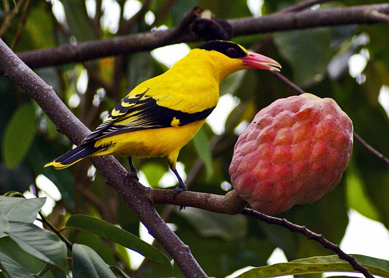 The black-naped oriole (Oriolus chinensis) is a passerine bird in the oriole family that is found in many parts of Asia. There are several distinctive populations within the wide distribution range of this species and in the past the slender-billed oriole (Oriolus tenuirostris) was included as a subspecies. Unlike the Indian golden oriole which only has a short and narrow eye-stripe, the black-naped oriole has the stripe broadening and joining at the back of the neck. Males and females are very similar although the wing lining of the female is more greenish. The bill is pink and is stouter than in the golden oriole.