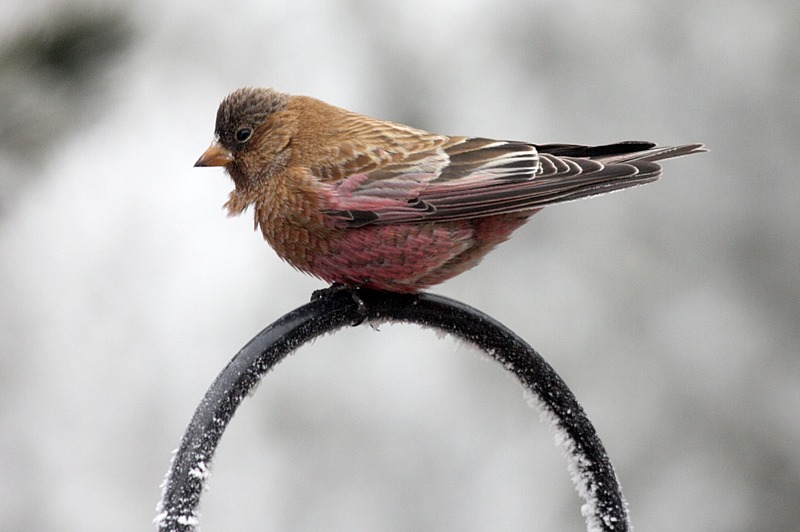 The brown-capped rosy finch (Leucosticte australis) is a medium-sized finch endemic to North America. Adults are brown on the head, back, and breast with pink on the belly, rump, and wings. The forehead is black. They have short black legs and a long forked tail. Their breeding habitat is mountain peaks in the central Rocky Mountains of the United States. They build a cup nest in a cavity on a cliff, or re-use abandoned cliff swallow nests. In winter, these birds migrate short distances to lower elevations. These birds forage on the ground, but may fly to catch insects in flight. They mainly eat seeds from weeds and grasses and insects. They often feed in small flocks. At one time, the three North American rosy finches were considered to be one species. The population of this bird appears…