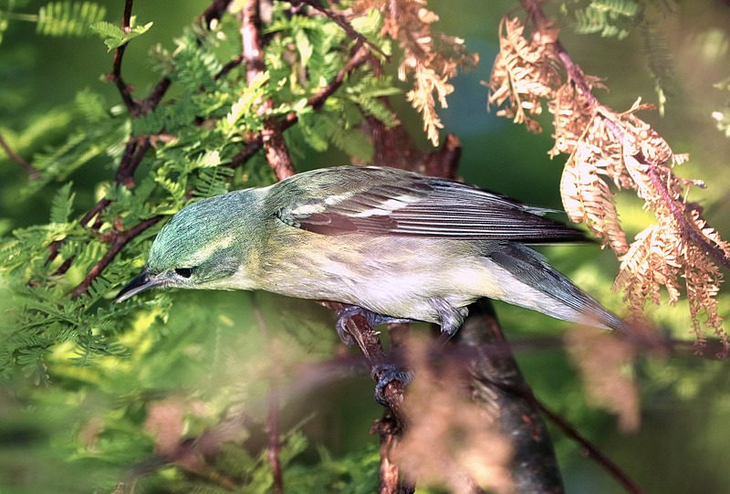 The cerulean warbler (Setophaga cerulea) is a small songbird of the New World warbler family. Adult males have pale cerulean blue and white upperparts with a black necklace across the breast and black streaks on the back and flanks. Females and immature birds have greyer or greenish upperparts, a pale stripe over the eye, and no streaking on the back and no neck. All of these birds have wing bars and a thin pointed bill. They are found in deciduous forests of eastern North America during the breeding season and then migrate to forested mountain areas in South America. The species is considered threatened with an IUCN status of near threatened, indicating it does not face any imminent threat of extinction in the wild.