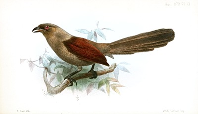 A coucal is one of about 30 species of birds in the cuckoo family. All of them belong in the subfamily Centropodinae and the genus Centropus. Unlike many Old World cuckoos, coucals are not brood parasites, though they do have their own reproductive peculiarity: all members of the genus are (to varying degrees) sex-role reversed, so that the smaller male provides most of the parental care. At least one coucal species, the black coucal, is polyandrous. Some species (Centropus phasianinus) have the male investing more in incubation and parental care. DNA evidence has indicated that they should be raised to family status, as Centropodidae.