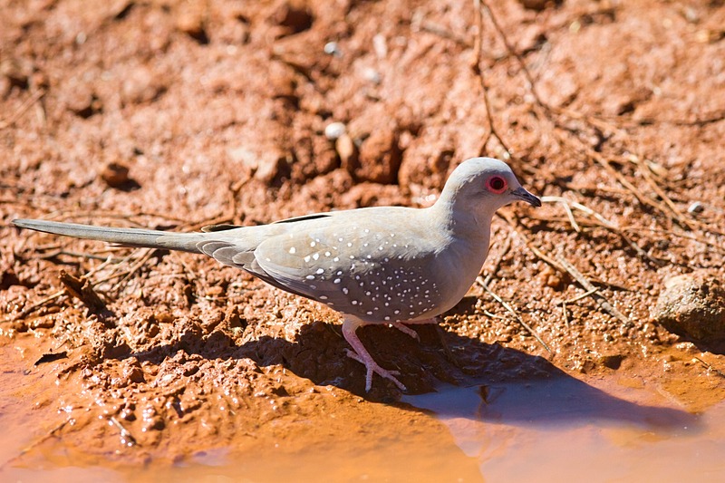 The diamond dove (Geopelia cuneata) is a resident bird in Australia. The dove predominantly exists in areas near water but which are lightly arid or semi-arid in nature, being Central, West and Northern Australia. They are one of Australia's smallest pigeons along with the peaceful dove. They have been spotted occasionally in Southern Australia in parks and gardens when the centre of Australia is very dry.