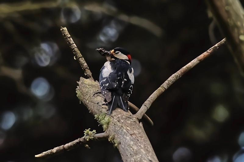 The great spotted woodpecker (Dendrocopos major) is a medium-sized woodpecker with pied black and white plumage and a red patch on the lower belly. Males and young birds also have red markings on the neck or head. This species is found across the Palearctic including parts of North Africa. Across most of its range it is resident, but in the north some will migrate if the conifer cone crop fails. Some individuals have a tendency to wander, leading to the recent recolonisation of Ireland and to vagrancy to North America. Great spotted woodpeckers chisel into trees to find food or excavate nest holes, and also drum for contact and territorial advertisement; like other woodpeckers, they have anatomical adaptations to manage the physical stresses from the hammering action. This species is…