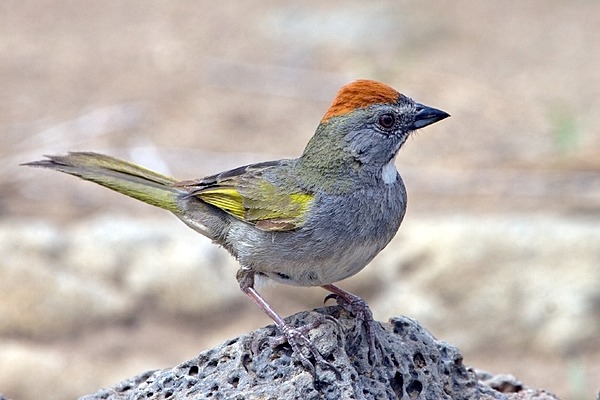 The green-tailed towhee (Pipilo chlorurus) is the smallest towhee, but is still one of the larger members of the American sparrow family Passerellidae. Its breeding range covers most of the interior Western United States, with a winter range in Mexico and the southern edge of the Southwestern United States. This bird can be recognized by the bright green stripes on the edge of its wings. It has a distinct white throat and a rufous cap. It measures 7.25 in (18.4 cm) long and weighs 29 g (1.0 oz).It is fairly tame, but often stays hidden under a bush. It is fairly common in habitats with sagebrush and other such bushes. It is uncommonly seen because of its tendency to stay under cover.