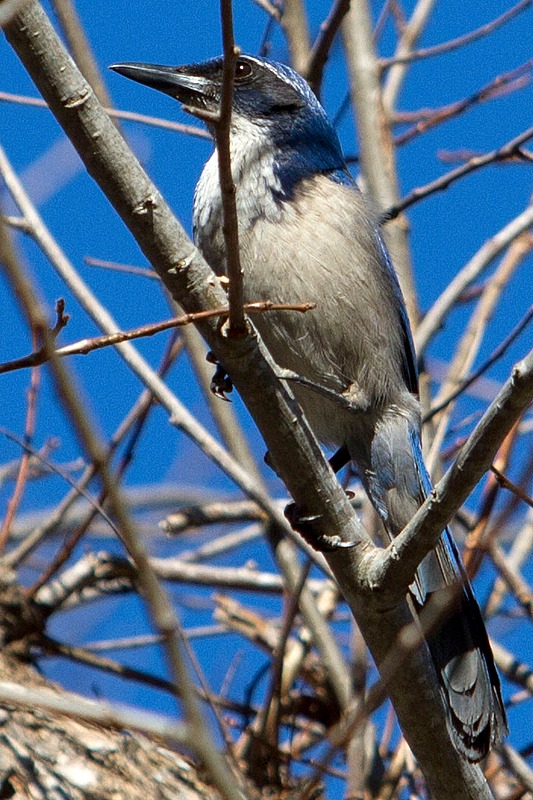 The island scrub jay (Aphelocoma insularis) also island jay or Santa Cruz jay is a bird in the genus, Aphelocoma, which is endemic to Santa Cruz Island off the coast of Southern California. Of the over 500 breeding bird species in the continental U.S. and Canada, it is the only insular endemic landbird species. The island scrub jay (ISSJ) is closely related to the California scrub jay – the coastal population found on the adjacent mainland – but differs in being larger, more brightly colored, and having a markedly stouter bill. They will bury, or cache, the acorns in the fall and may eat them months later. They also eat insects, spiders, snakes, lizards, mice and other birds' eggs and nestlings.
