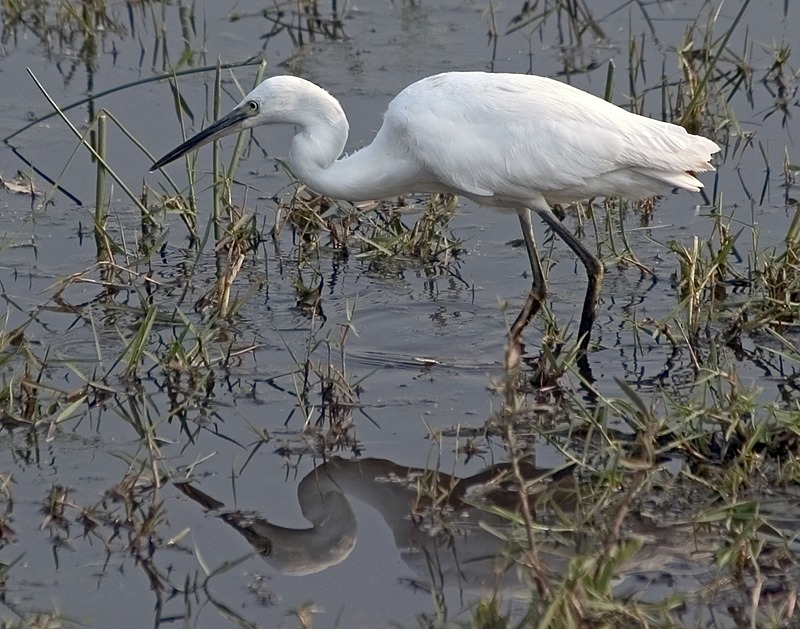 The little egret (Egretta garzetta) is a species of small heron in the family Ardeidae. The genus name comes from the Provençal French Aigrette, "egret", a diminutive of Aigron, "heron". The species epithet garzetta is from the Italian name for this bird, garzetta or sgarzetta.It is a white bird with a slender black beak, long black legs and, in the western race, yellow feet. As an aquatic bird, it feeds in shallow water and on land, consuming a variety of small creatures. It breeds colonially, often with other species of water birds, making a platform nest of sticks in a tree, bush or reed bed. A clutch of three to five bluish-green eggs is laid and incubated by both parents for about three weeks. The young fledge at about six weeks of age. Its breeding distribution is in wetlands in…