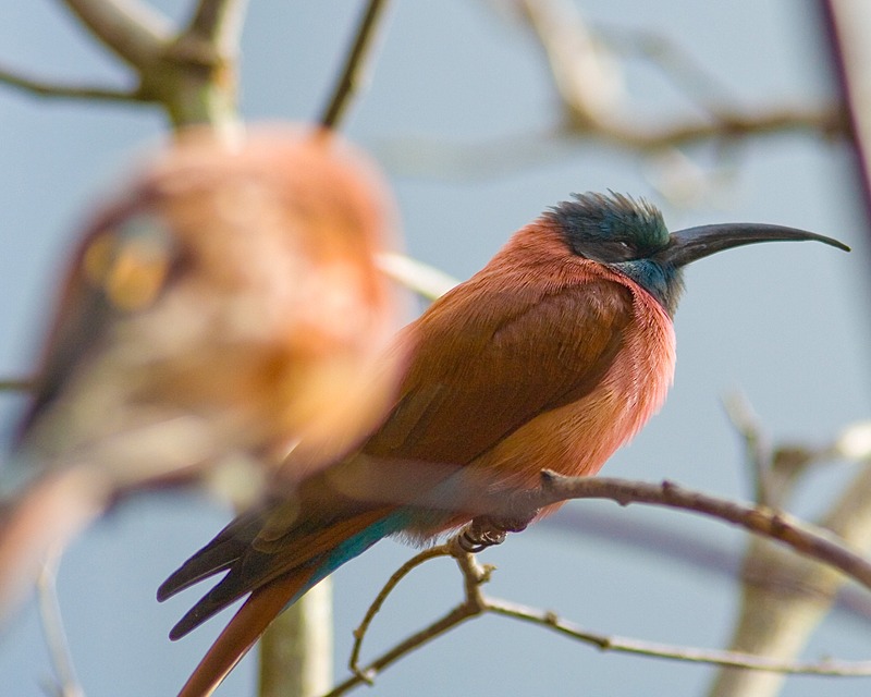 The northern carmine bee-eater (Merops nubicus or M. n. nubicus) is an African near passerine bird in the bee-eater family, Meropidae. Alternative common names include the carmine bee-eater or the Nubian bee-eater. It is closely related to the southern carmine bee-eater where the throat is carmine (instead of blue).