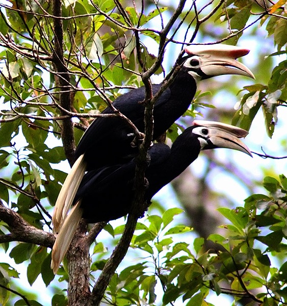 The Palawan hornbill (Anthracoceros marchei), known as Talusi in the Philippine language Cuyunon, is a largish (approximately 70 centimetres (28 in) long, weighing 750 grams (26 oz), more than 92% of bird species) forest-dwelling bird. Its plumage is predominantly black, with a white tail, a dark green gloss on its upper parts and a large creamy-white beak with a casque typical of the hornbill family. It emits loud calls which can be transcribed as kaaww and kreik-kreik. Nine species of hornbill are found in the Philippines, and the Palawan hornbill is endemic to Palawan island, but has also been recorded on the nearby islands of Balabac, Busuanga, Calauit, Culion and Coron. Most visiting birdwatchers travel to St Paul's National Park, Palawan, to see this bird, but it is now uncommon. It…