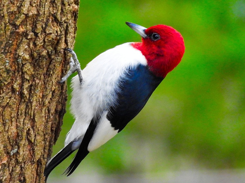 The red-headed woodpecker (Melanerpes erythrocephalus) is a small or medium-sized woodpecker from temperate North America. Their breeding habitat is open country across southern Canada and the eastern-central United States. It is rated as least concern on the International Union for Conservation of Nature (IUCN)'s Red List of Endangered species, having been downlisted from near threatened in 2018.The red-bellied woodpecker also has its most prominent red part of its plumage on the head, but it looks quite different in other respects.