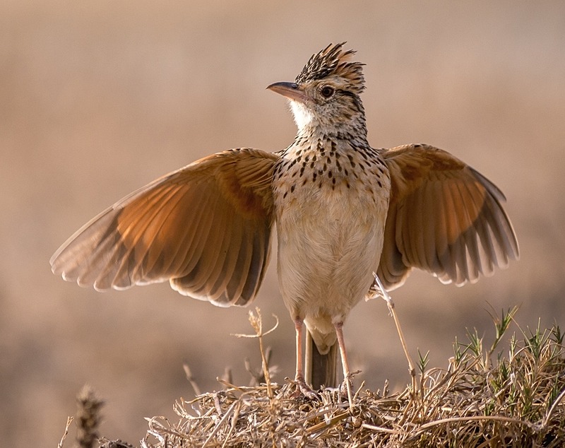 The rufous-naped lark (Mirafra africana) or rufous-naped bush lark is a widespread and conspicuous species of lark in the lightly wooded grasslands, open savannas and farmlands of the Afrotropics. Males attract attention to themselves by their bold and repeated wing-fluttering displays from prominent perches, which is accompanied by a melodious and far-carrying whistled phrase. This rudimentary display has been proposed as the precursor to the wing-clapping displays of other bush lark species. They have consistently rufous outer wings and a short erectile crest, but the remaining plumage hues and markings are individually and geographically variable. It has a straight lower, and longish, curved upper mandible.