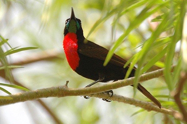 The scarlet-chested sunbird (Chalcomitra senegalensis) is a species of bird in the family Nectariniidae. It is found in Angola, Benin, Botswana, Burkina Faso, Burundi, Cameroon, Central African Republic, Chad, Democratic Republic of the Congo, Ivory Coast, Eritrea, Ethiopia, Gambia, Ghana, Guinea, Guinea-Bissau, Kenya, Malawi, Mali, Mauritania, Mozambique, Namibia, Niger, Nigeria, Rwanda, Senegal, Sierra Leone, South Africa, Sudan, Swaziland, Tanzania, Togo, Uganda, Zambia, and Zimbabwe.