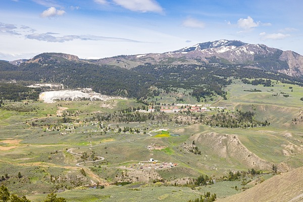 Sepulcher Mountain on right, Clagett Butte above Mammoth Hot Springs’s mineral terrace, Jacob W. Frank (NPS) photograph above.