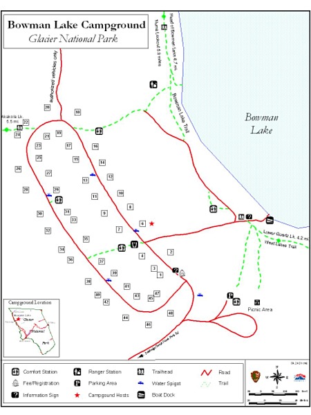 Bowman Lake campground is located in the North Fork area of Glacier National Park approximately 32.5 miles from the west entrance, and 30 miles from the Canadian border. Summer operation: 5/21 - 9/13. $15/night