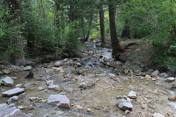 The upper campground offers broader views, but is not located on the creek. It is located the dead end of the old highway road, but there are hillside campsites dispersed along the road all the way from lower loop up to the top of the road.