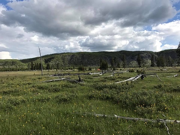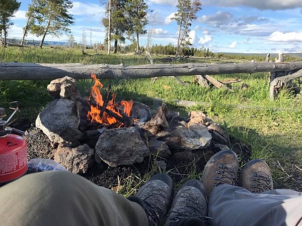 This site is completely in the meadow right on the edge of a marsh. Our view opens up to Fairy Falls which is a breathtaking backdrop for a lasagna dinner.