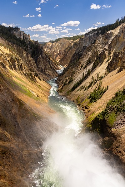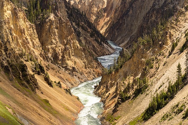 The canyon below the Lower Falls was at one time the site of a geyser basin that was the result of rhyolite lava flows, extensive faulting, and heat beneath the surface (related to the hotspot). No one is sure exactly when the geyser basin was formed in the area, although it was probably present at the time of the last glaciation. The chemical and heat action of the geyser basin caused the rhyolite rock to become hydrothermally altered, making it very soft and brittle and more easily erodible (sometimes compared to baking a potato). Evidence of this thermal activity still exists in the canyon in the form of geysers and hot springs that are still active and visible. The Clear Lake area (Clear Lake is fed by hot springs) south of the canyon is probably also a remnant of this activity.According to Ken Pierce, US Geological Survey geologist, at the end of the last glacial period, about 14,000 to 18,000 years ago, ice dams formed at the mouth of Yellowstone Lake. When the ice dams melted, a great volume of water was released downstream causing massive flash floods and immediate and catastrophic erosion of the present-day canyon. These flash floods probably happened more than once. The canyon is a classic V-shaped valley, indicative of river-type erosion rather than glaciation. The canyon is still being eroded by the Yellowstone River.The colors in the canyon are also a result of hydrothermal alteration. The rhyolite in the canyon contains a variety of different iron compounds. When the old geyser basin was active, the “cooking” of the rock caused chemical alterations in these iron compounds. Exposure to the elements caused the rocks to change colors. The rocks are, in effect, oxidizing; the canyon is rusting. The colors indicate the presence or absence of water in the individual iron compounds. Most of the yellows in the canyon are the result of iron present in the rock rather than sulfur, as many people think.
