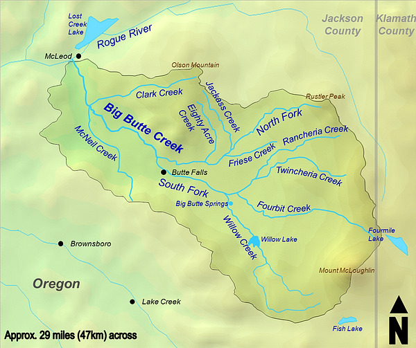 Big Butte Creek is a 12-mile-long (19 km) tributary of the Rogue River in the U.S. state of Oregon. It drains approximately 245 square miles (635 km2) of Jackson County. Its two forks, the North Fork and the South Fork, both begin high in the Cascade Range near Mount McLoughlin. Flowing predominantly west, they meet near the city of Butte Falls. The main stem flows generally northwest until it empties into the Rogue Falls was incorporated in 1911, and remains the only incorporated town within the watershed's boundaries. Big Butte Creek's watershed was originally settled over 8,000 years ago by the Klamath, Upper Umpqua, and Takelma tribes of Native Americans. In the Rogue River Wars of the 1850s, most of the Native Americans were either killed or forced onto Indian reservations. The first…