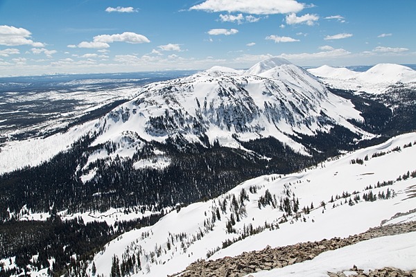 The headwaters of Indian Creek in a winter photograph of Dome Mountain (center) with Mount Holmes and its Lookout Tower behind it, Neal Herbert (NPS) photograph above.