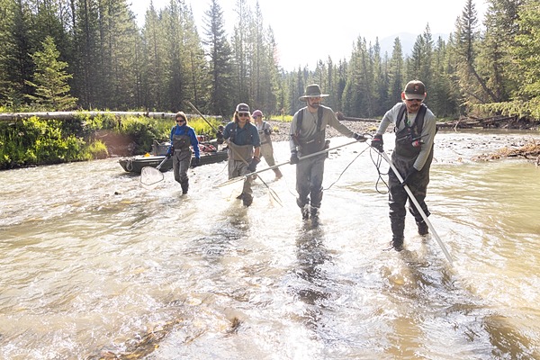 Fisheries crew electroshocking along Soda Butte Creek, Jacob W. Frank (NPS) photograph above.