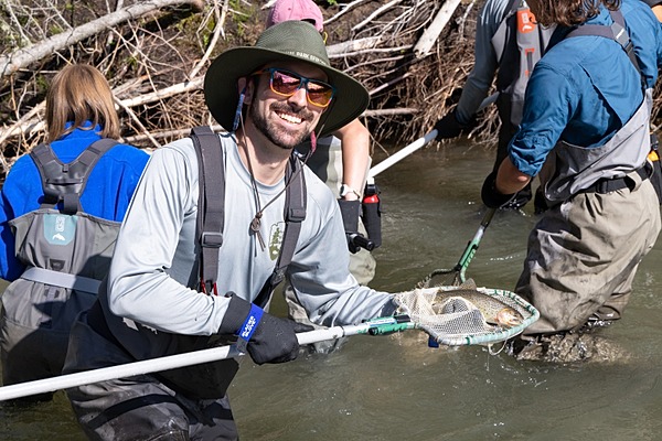 Fisheries crew member and captured Yellowstone cutthroat trout, Jacob W. Frank (NPS) photograph above.