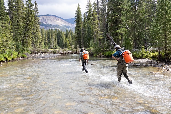 Transferring Yellowstone cutthroat trout to backpacks, Jacob W. Frank (NPS) photograph above.