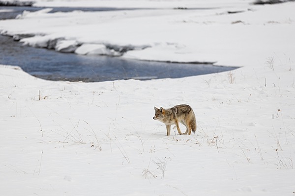 A coyote stands in the snow near Soda Butte Creek, A. Falgoust (NPS) photograph above.