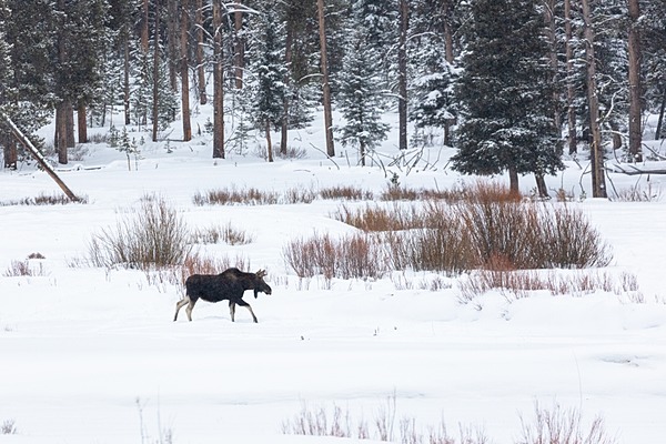 A bull moose walks through a snowy meadow near Soda Butte Creek, Jacob W. Frank (NPS) photograph above.