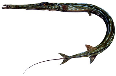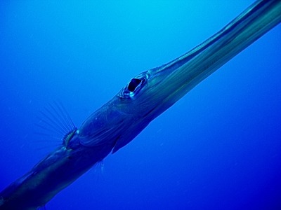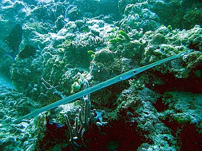 The cornetfishes or flutemouths are a small family, the Fistulariidae, of extremely elongated fishes in the order Syngnathiformes. The family consists of a single genus, Fistularia, with four species, found worldwide in tropical and subtropical marine environments. Ranging up to 200 cm (6.6 ft) in length, cornetfishes are as thin and elongated as many eels, but are distinguished by very long snouts, distinct dorsal and anal fins, and forked caudal fins whose center rays form a lengthy filament. The lateral line is well-developed and extends onto the caudal filament.They generally live in coastal waters or on coral reefs, where they feed on small fishes, crustaceans, and other invertebrates.Cornetfish are of minor interest for fishing, and can be found in local markets within their range.