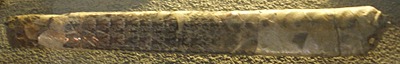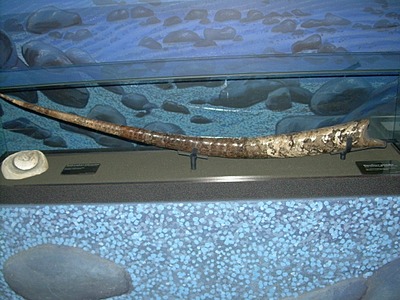 Baculites ("walking stick rock") is an extinct genus of cephalopods with a nearly straight shell, included in the heteromorph ammonites. The genus, which lived worldwide throughout most of the Late Cretaceous, was named by Lamarck in 1799. The adult shell of Baculites is generally straight and may be either smooth or with sinuous striae or ribbing that typically slant dorso-ventrally forward. The aperture likewise slopes to the front and has a sinuous margin. The venter is narrowly rounded to acute while the dorsum is more broad. The juvenile shell, found at the apex, is coiled in one or two whorls and described as minute, about 1 centimetre (0.39 in) in diameter. Adult Baculites ranged in size from about 7 centimetres (2.8 in) (Baculites larsoni) up to 2 metres (6.6 ft) in length. As…